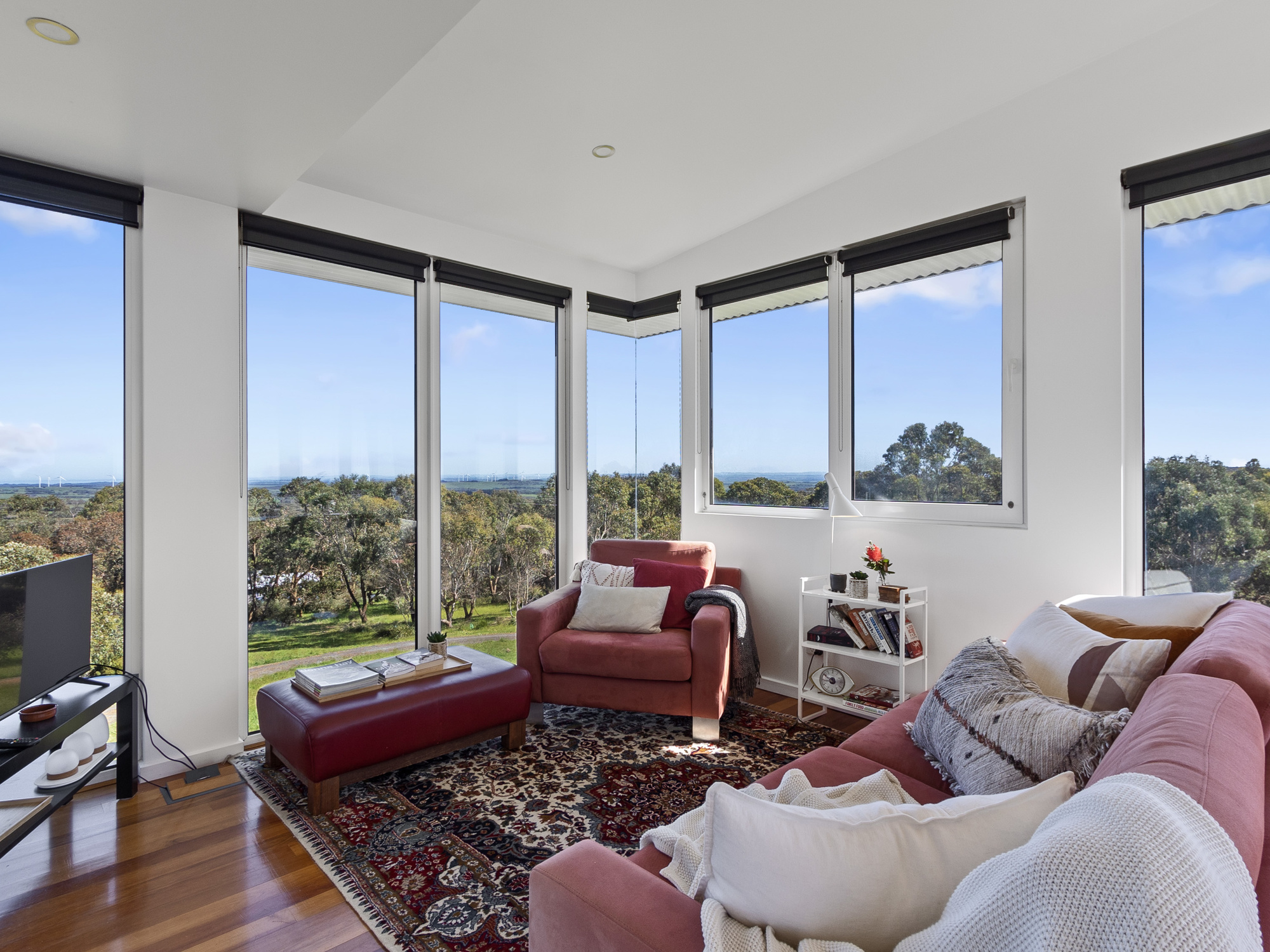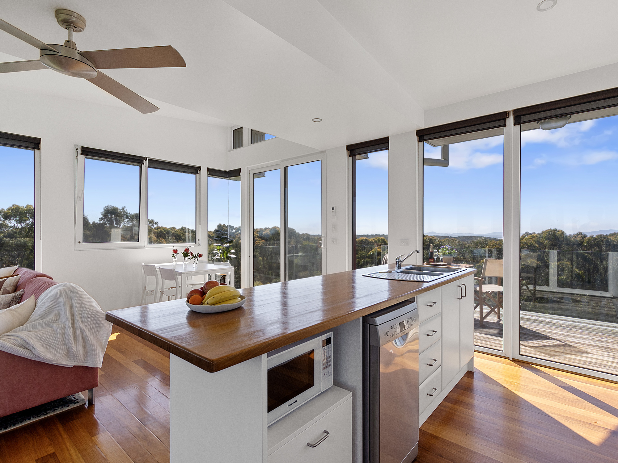 Floor to ceiling double glazed windows look out over the serene eucalypt forest of Cape Liptrap Coastal Park, the ever-changing ocean of Waratah Bay, world famous Wilsons Prom', the rolling green hills of the Hoddle Ranges and the distant wind turbines at Tarwin Lower.