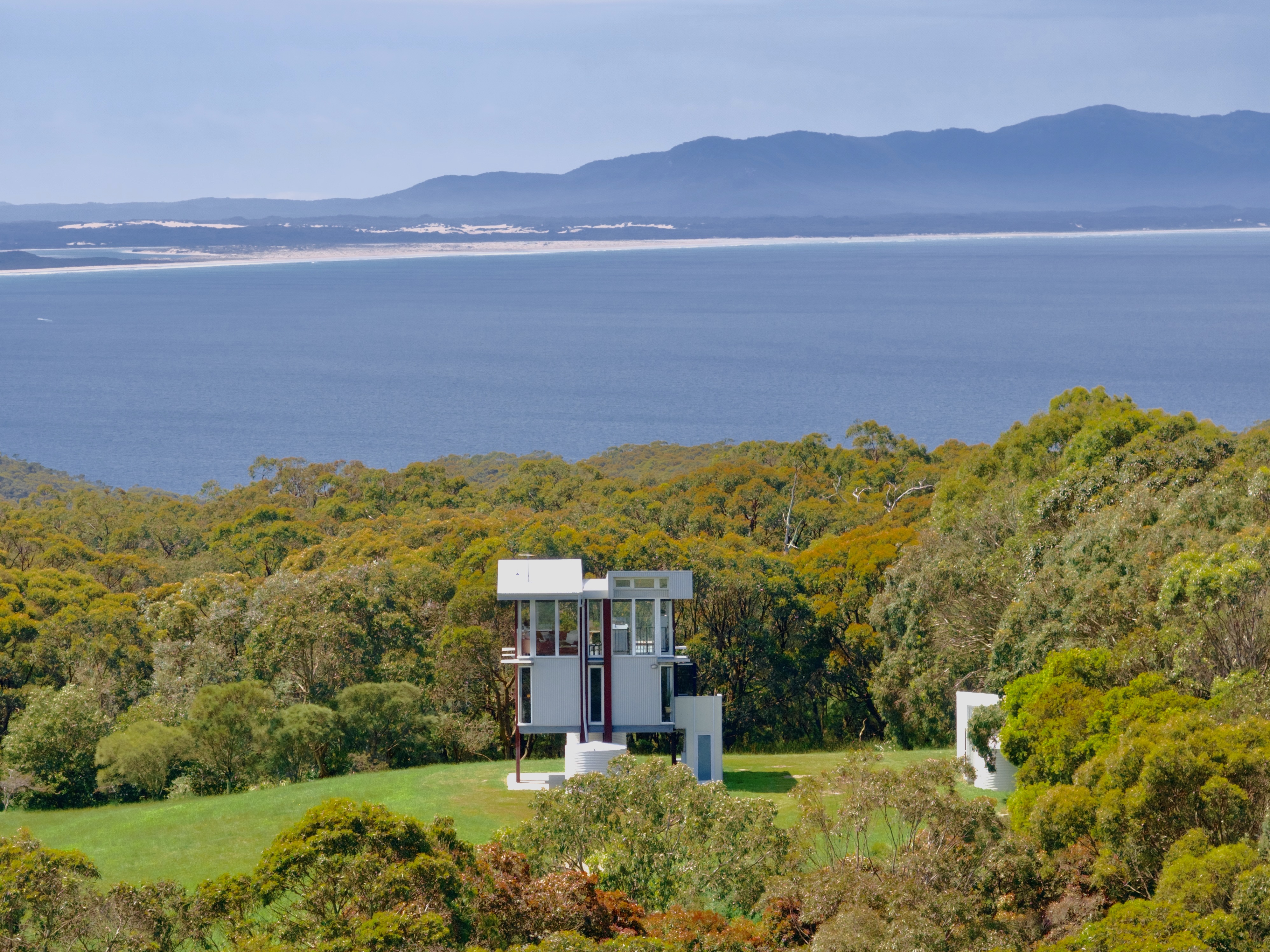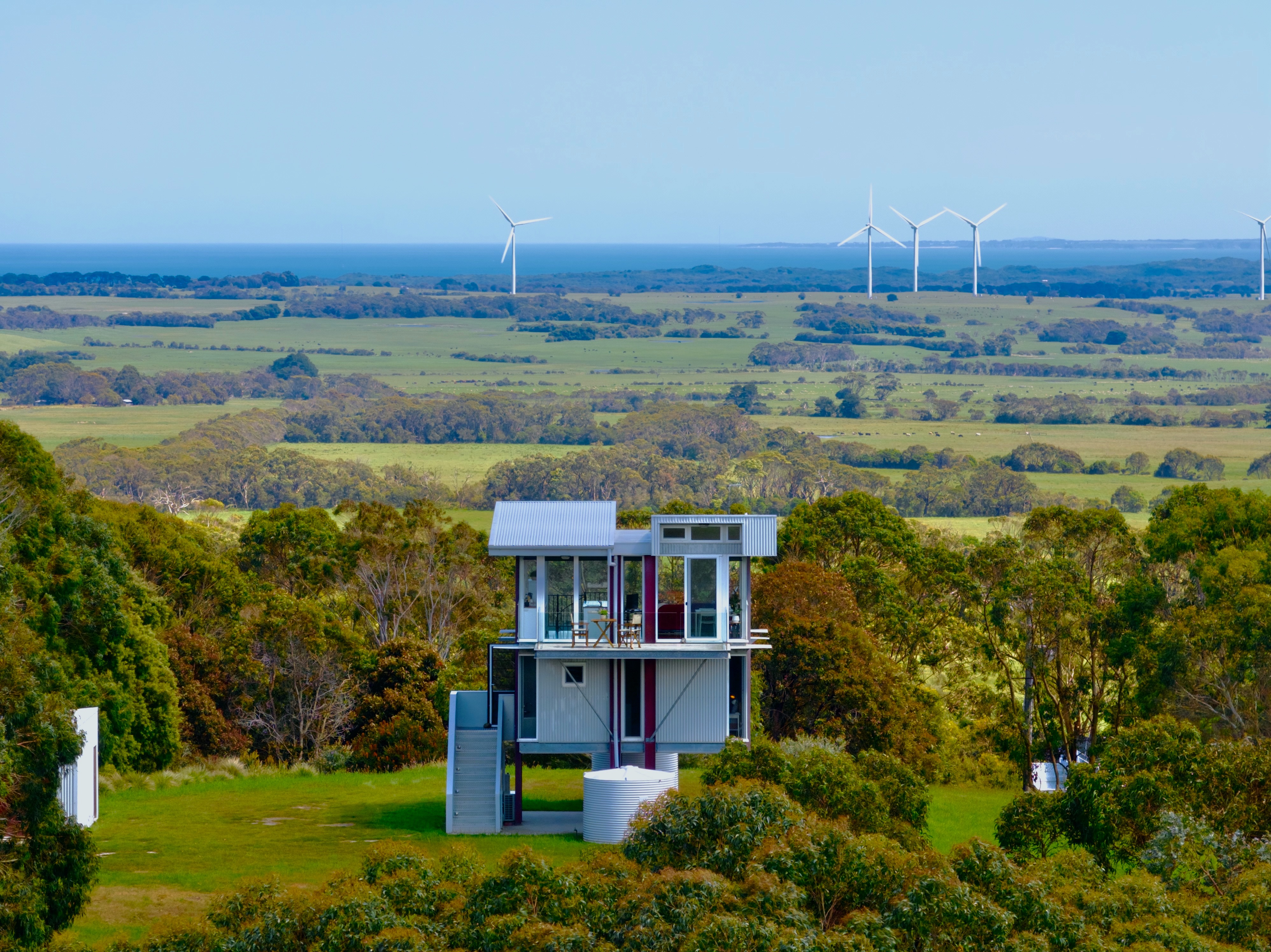 The multi-level home appears to float above the ground and brings the dramatic surrounding ocean, coastal and rural views right into the 3rd floor living room.