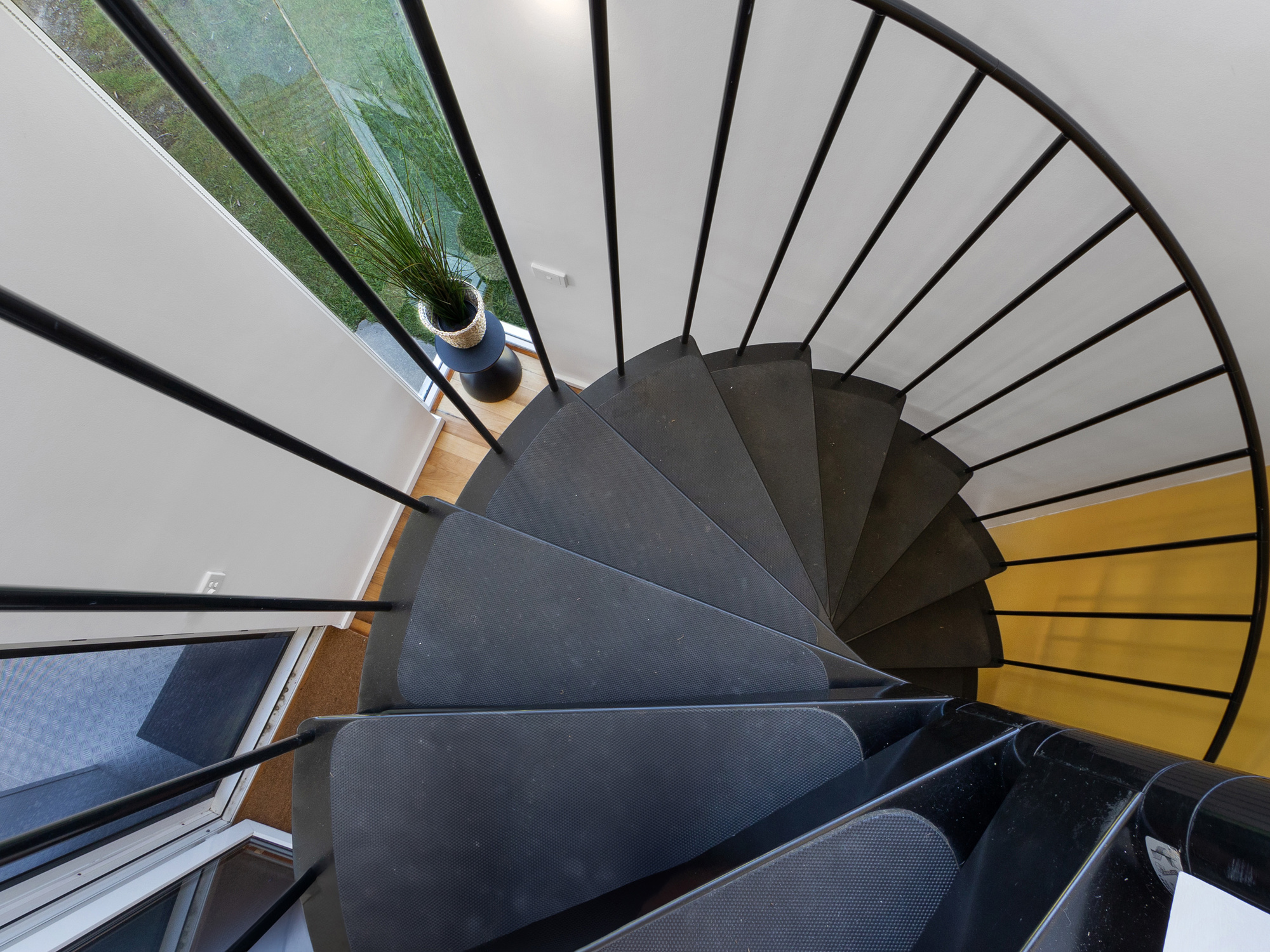 The 1st floor, holds 2 light and airy bedrooms and a roomy bathroom, again cooled by sea breezes and warmed with electric heaters. The laundry and additional storage are located on the ground floor at the base of the sculptural stairs.
